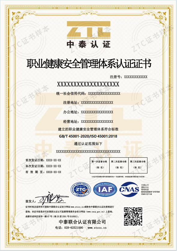 認證標準:GB/T 45001-2020/ISO 45001:2018《職業健康安全管理體系要求及使用指南》