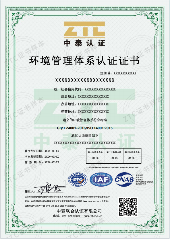 認(rèn)證標(biāo)準(zhǔn):GB/T 24001-2016/ISO 14001:2015《環(huán)境管理體系 要求及使用指南》
