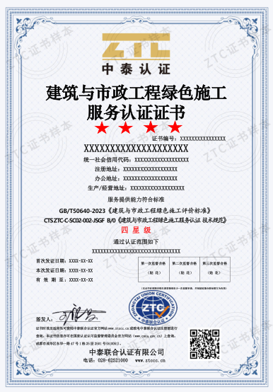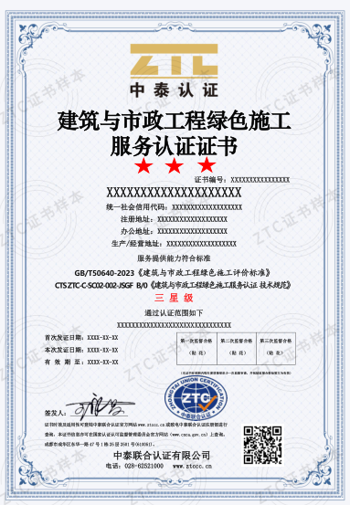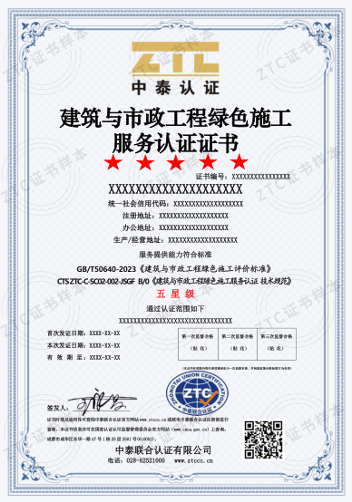 認證標(biāo)準(zhǔn):CTS ZTC-C-SC02-002-JSGF B/0《建筑與市政工程綠色施工服務(wù)認證技術(shù)規(guī)范》和GB/T 50640-2023《建筑與市政工程綠色施工評價標(biāo)準(zhǔn)》