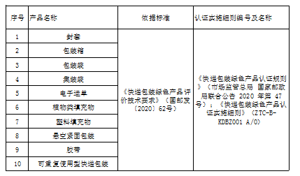 ? 《快遞包裝綠色產(chǎn)品認證目錄(第一批)》:明確了首批納入認證的快遞包裝產(chǎn)品種類,包括封套、包裝箱、包裝袋、集裝袋、電子運單、紙質(zhì)填充物、塑料類填充物、懸空緊固包裝、膠帶和可重復使用型快遞包裝等十類產(chǎn)品。
