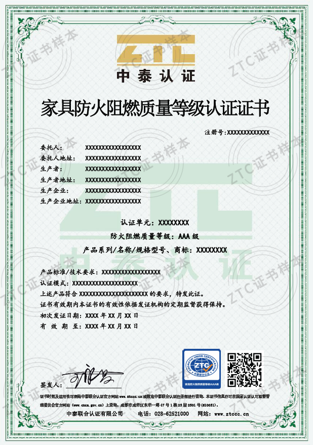 ZTC-B021 B/0 《家具防火阻燃質量等級AAA級認證實施規則》