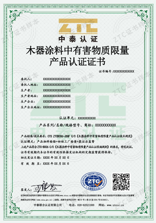 認證標準:CTS ZTCB006-JSGF C/0 《木器涂料中有害物質(zhì)限量產(chǎn)品認證技術(shù)規(guī)范》
