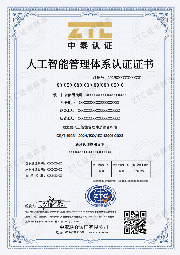 上述認證規則歸中泰聯合認證有限公司所有,中泰聯合認證有限公司對其擁有最終解釋權。任何組織及個人未經中泰聯合認證有限公司許可,不得以任何形式全部或部分使用(法律要求除外)認證相關信息。如需獲取相關實施規則請與以下聯系方式獲取:? 提升企業形象與競爭力:獲得認證如同為企業貼上“優質標簽”,彰顯企業在人工智能領域的專業與責任擔當,吸引更多客戶與合作伙伴,增強市場競爭力。