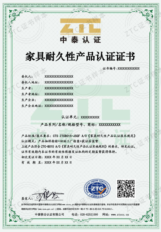 認證規(guī)則:ZTC-B015 A/0 《家具耐久性產(chǎn)品認證實施規(guī)則》