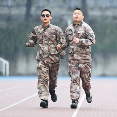 2020年1月2日,“排雷英雄戰士”杜富國(左)和戰友在陸軍軍醫大學操場上跑步。