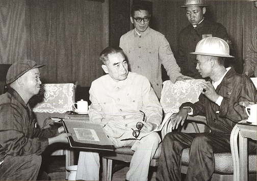 1966年9月,周恩來(lái)同大慶石油“鐵人”王進(jìn)喜(左一)等交談