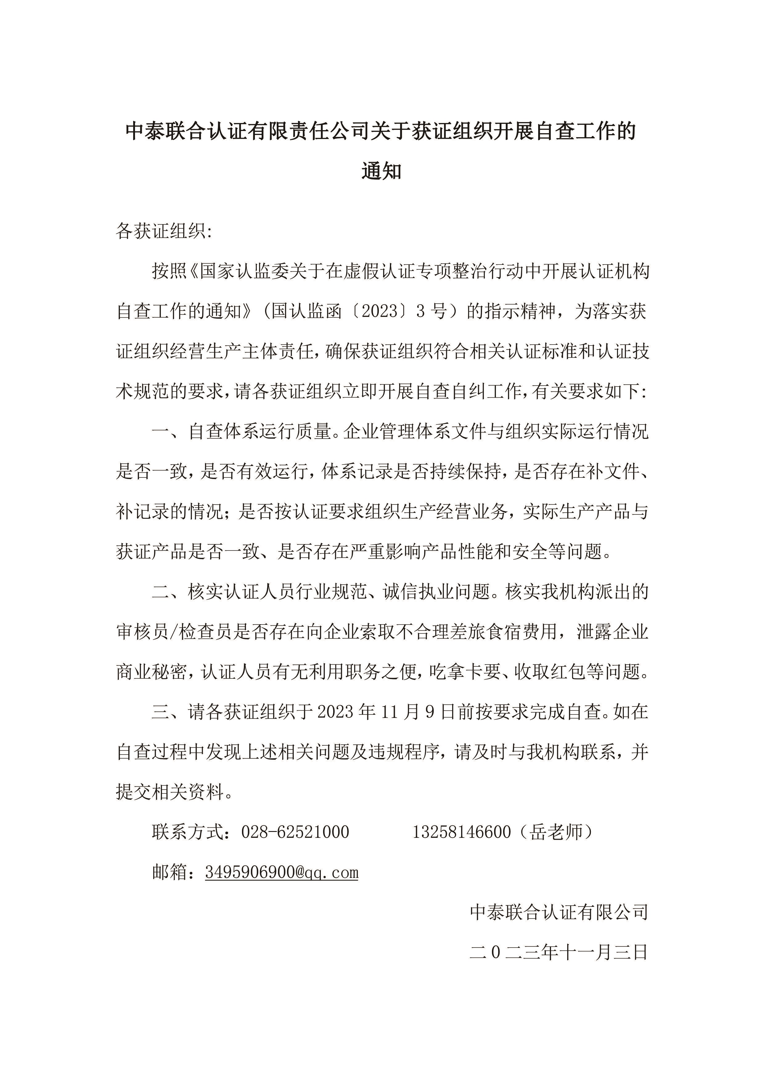 中泰聯合認證有限責任公司關于獲證組織開展自查工作的通知